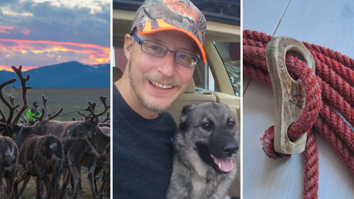 Kalvmärkning. Samen och renskötaren Jonas Vannar tillsammans med hunden Mira. En traditionell rikkas gjord av renhorn. Foton Jonas Vannar.